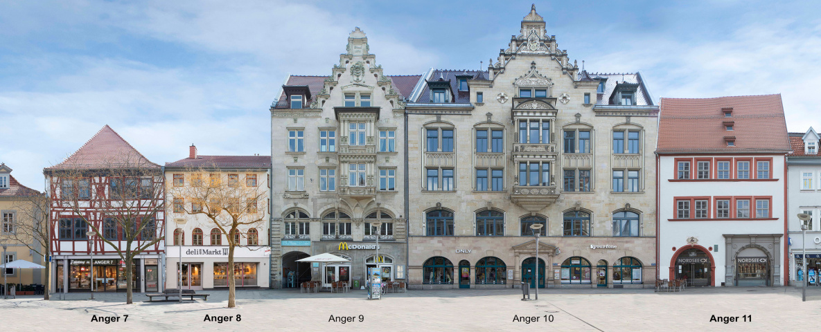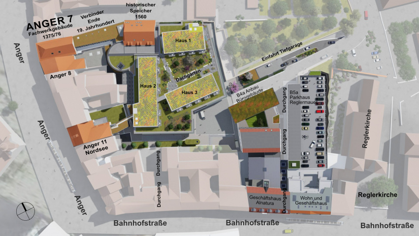 Im Kern der Stadt Erfurt, zwischen dem Areal der Reglermauer und dem Anger sowie von der Bahnhofstraße zum Klostergarten des Ursulinenklosters, wird die ehemals baulich brachliegende und mehr oder minder ungenutzte innerstädtische Fläche wieder buchstäblich neu zum Leben erweckt. Es erfolgt ein Brückenschlag zwischen Denkmal und Moderne, der gleichzeitig das innerstädtische Gefüge ganzheitlich und zukunftsorientiert zusammenfügt. Als letzter Meilenstein im Areal, nach der bereits erfolgreich umgesetzten Sanierung und Neubebauung der Bereiche Bahnhofstraße 4a und 5a mit dem neuen Parkhaus Reglermauer, erfolgt nun der Lückenschluss zur historischen Bebauung am Anger. Dabei werden sowohl die vorhandenen städtebaulichen, als auch die verkehrstechnischen Strukturen des innerstädtischen Gefüges berücksichtigt und behutsam zusammengefügt. Die belebte Innenstadt mit ihrer brodelnden Vielfalt aus Wohnen, Einkaufen, Arbeiten und Leben, spiegelt sich im neuen Zentrum wieder. Hier entstehen im sanierten historischen Bestand sechs und im Neubau vierundfünfzig moderne helle Wohnungen unterschiedlicher Größe und Zuschnitte. Davon formen 30 Wohneinheiten auf dem einzigartig mit Bäumen, Büschen und Sträuchern begrünten Dachgartenbereich ein neues eigenes kleines Quartier über den Dächern der Stadt. Vielfältige Büroflächen verschiedenster Nutzer sowie Verkaufs- und Erlebnisflächen mit kulinarisch reichhaltiger Gastronomie befinden sich im 1. OG und im EG. Das innerstädtische Leben in seiner ganzen Vielfalt wird somit aufgegriffen, in neuen Strukturen abgebildet und mit einem positiv vorwärts gerichteten Blick in die Zukunft ganzheitlich weiterentwickelt.