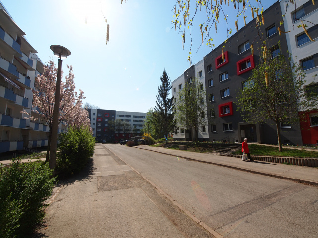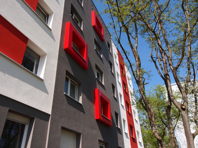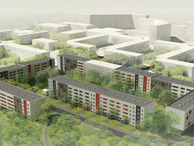 Dieses Bild sollte mit der ohnehin geplanten energetischen Sanierung weichen. Kern des Entwurfs war dabei die Schaffung kleinteiliger Gebäude- und Fassadenstrukturen. Durch einen Wechsel von Farben, Oberflächenstrukturen, verspringenden Putzflächen und Gebäudehöhen wurde aus der monotonen Reihung typisierter Plattenbauten eine lockere Anordnung zeitgemäßer Fassadensegmente.