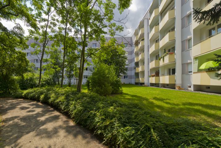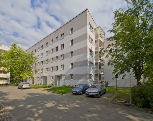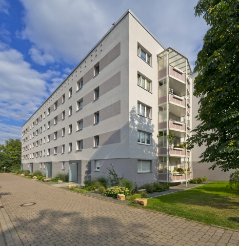 Im Zuge der Baumaßnahme wurde der Gebäudekomplex ganzheitlich energetisch saniert und mit einem zurückhaltenden Farbkonzept gestaltet, da bereits erfolgte Teilsanierungen mit einzubeziehen waren. An zwölf der 44 Hauseingänge wurden neue Eingangsüberdachungen inkl. Rollator-Boxen errichtet. Die angrenzenden Außenanlagen wurden neu gestaltet und in den Innenhöfen wurden notwendige Feuerwehraufstellflächen realisiert.