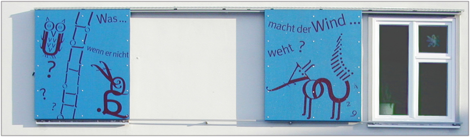 Mit seinen blauen Schiebeläden erhielt das Gebäude von außen ein neues, frisches Aussehen. Die unmittelbare Umgebung mit der Kirche vis à vis erfährt eine Aufwertung, ohne daß sich der Kindergarten in den Vordergrund drängt.