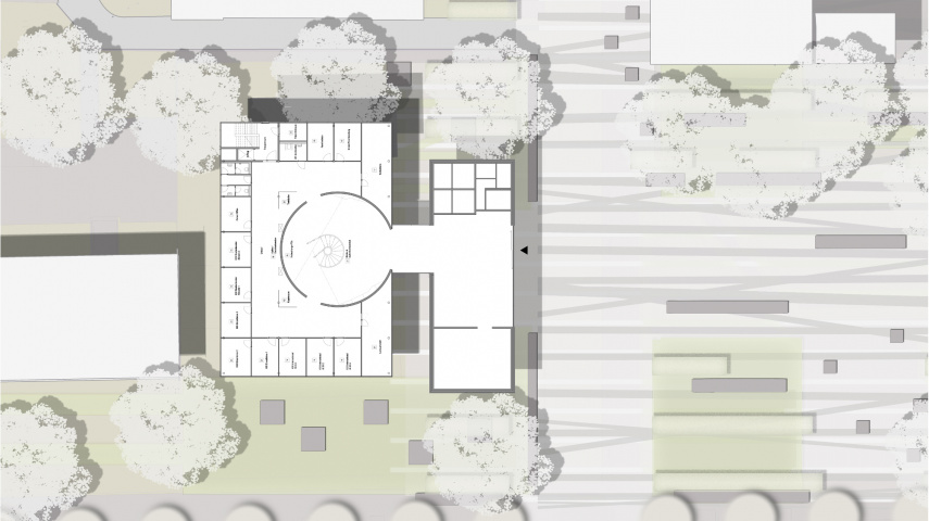 Um den Lichteinfall ins Innere des Gebäudes bis ins Erdgeschoss sicherzustellen, durchstößt die Kugel des Foyers das Dach und lässt Ausblick auf den Himmel zu, was zugleich Ausdruck der geistigen Aufgeschlossenheit von Lehre und Forschung ist. Abseits des großen Oberlichts ist ein Gründach vorgesehen, da dieses nicht nur ökologisch sinnvoll ist, sondern auch einen erheblichen Teil zur Kühlung des Gebäudes und der Umgebung beitragen kann. Ebenso schneidet die Kugel die Südfassade, um die Bedeutung des Gebäudes auch von außen ersichtlich zu machen. Durch kleine dreieckige Öffnungen, die sich zu Mosaiken an der Wand der Kugel zusammenfinden, werden Verbindungen zwischen Foyer und Geschossen geschaffen. Für die raumbildenden Bauteile ist eine Mischung aus verglasten Elementen und leichten, nichttragenden Wände vorgesehen. Der hohe Anteil an transparenten Bauteilen kommt nicht nur der gesamten Formsprache des Gebäudes zugute, es reduziert sich dadurch auch die Notwendigkeit von künstlicher Beleuchtung, da nahezu alle Bereiche des Gebäudes mit Tageslicht versorgt werden.