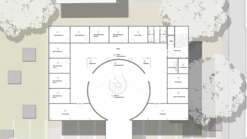 Das Gebäude umfasst drei Obergeschosse sowie ein Kellergeschoss, in welchem das Rechenzentrum URZ inklusive Server-, Technik- und Archivräumen untergebracht ist. Im Erdgeschoss werden neben geschlossenen Einzelbüros und Beratungsstellen auch offene Kommunikations- und Servicebereiche wie das Kontaktbüro und die Lernwerkstatt angeordnet. Durch das Rastersystem von viereinhalb auf sieben Meter, das in der Tiefe noch einmal halbiert wird, entstehen gut nutzbare Bürogrößen von ca. 15 m² für jeweils ein bis zwei Arbeitsplätze. Das großzügige Foyer fungiert – neben der vertikalen Erschließung über eine großzügige Wendeltreppe – als Aufenthalts- und Wartebereich für Studierende und Mitarbeitende. Weitere Einzelbüros werden in den Obergeschossen angeboten.