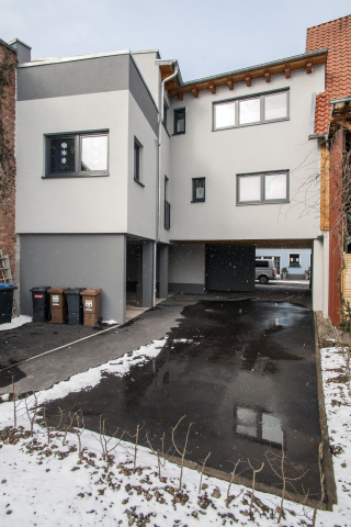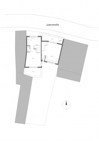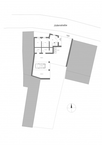 Auf den Grundstücken der Jüdenstraße 31 und 33 befanden sich 2 Gebäude, die zum Teil nur noch als Ruinen wahrgenommen werden konnten. Durch den unvermeidbaren Abbruch dieser Gebäude wurde der Weg frei für ein neues Projekt. Die übertragene Bauherrenaufgabe hier einen Neubau für zwei Familien, inkl. PWK-Stellplätze zu schaffen, wurde folgendermaßen umgesetzt: Städtebaulich befindet sich der Neubau in einem historisch geschlossenen Straßenzug, dem teilweise wieder gefolgt wurde. Durch das begrenzte Baufeld wurde entschieden, hier zwei Maisonette-Wohnungen zu planen, die über eine gemeinsame Treppe zum 1. Obergeschoss hin erschlossen werden und intern das 2. Obergeschoss erreichen. Beide Wohnungen haben jeweils eine großzügige Terrasse, die sich an einen offenen Wohn- und Küchenbereich anschließt. Durch die unterschiedliche Gestaltung der Dachform, der Dachabschlüsse sowie auch durch den Umgang mit dem Baukörper (der westliche Teil des Baukörpers wurde von der Straßenlinie zurückgesetzt), sind die Maisonette-Wohnungen von außen ablesbar. Im Erdgeschoss befindet sich zum einen die neue Erschließung zu den Wohnungen und die überbaute Durchfahrt zu den Stellplätzen, die sich unter dem westlichen Teil des Baukörpers befinden. Außerdem befinden sich im Erdgeschoss ein gemeinsamer Hauswirtschaftsraum und die von außen erschlossenen Kellerabteile.