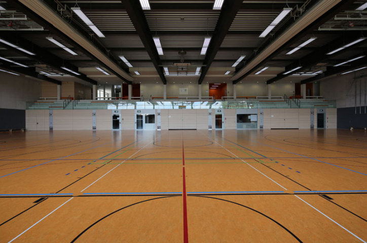 Die Betonkonstruktionen der Gebäude konnte in kostengünstiger Betonteilfertigbauweise entstehen. Da der Großteil der Fassadenaußenfläche im Erdreich liegt, entstanden geringe Kosten für die Fassade. Die Belichtung der Sporthalle erfolgt ausschließlich von Norden.