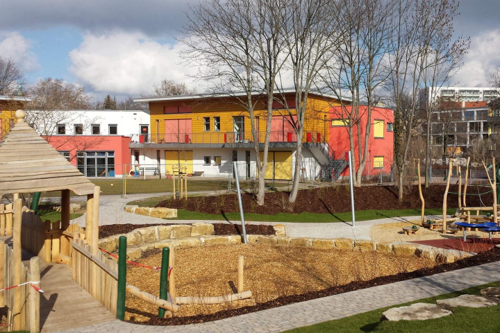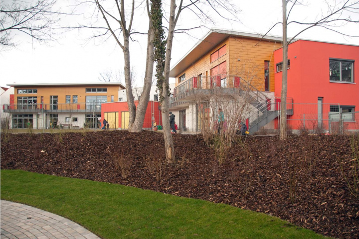 Das erforderliche Raumprogramm für insgesamt 120 Kinder, die verkehrstechnische Erschließung und die Gewährleistung des KITA-Betriebes im Altbau während der Bauzeit waren mit entscheidend für Standortwahl und Grundform des zweigeschossigen Bauwerks. Eine klare Gliederung aller Funktionsbereiche, untersetzt durch ein Farbkonzept, das zur Unterscheidung der Gruppenbereiche mit dem Wechsel von Komplementärfarben spielt, eine möglichst natürliche Belichtung und Belüftung aller Räume sowie der direkte Zugang von allen Gruppenräumen zum Außenareal bildeten die wichtigsten Planungsprämissen. Die symmetrisch angeordneten Gebäudeflügel beherbergen die Gruppenbereiche. Im Mitteltrakt befinden sich Gemeinschafts- und Nebenräume. Die Freianlagen wurden durch das Büro Friedemann+Weber, Erfurt, geplant.