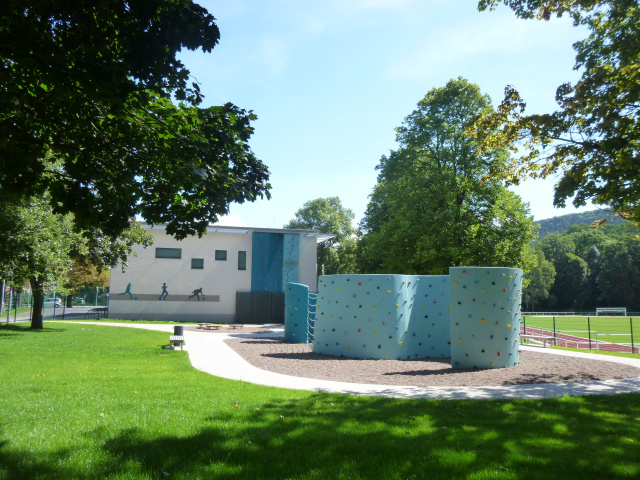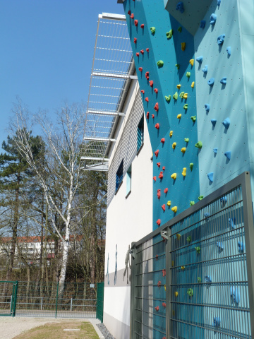 An der Westfassade der Halle innerhalb des Stadiongeländes befindet sich eine Kletteranlage mit 3 Kletterlinien und Überhängen im oberen Bereich. Ergänzend zur Kletteranlage wurde westlich der Sporthalle eine Bewegungsfläche angelegt, die mit Boulderwänden, Kletternetzen und Balanciergeräten spielerisch zur Schulung der Motorik animiert.