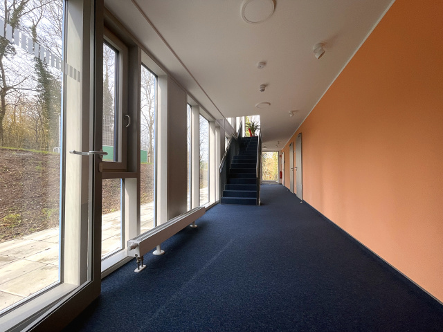 Für den Erweiterungsbau der Kurklinik Sophie wurde ein zweigeschossiger Riegel in Nord-Süd-Ausrichtung geplant. Er beherbergt 15 Patientenzimmer inklusive Bad sowie Bereitschafts- und Funktionsräume. Durch die Einbettung des Anbaus in die bestehende Hangsituation konnten im ersten Obergeschoss der direkte Zugang in das Außengelände und auf der Ostseite im Erdgeschoss acht Unterstellplätze für Fahrzeuge geschaffen werden. Bei der Farb- und Materialgestaltung wurde mit neuen Akzenten auf die Bestandsgebäude reagiert. Die den Patientenzimmern vorgelagerte großzügige Balkonanlage ermöglicht den Blick auf die waldigen Höhen an der Ilm.