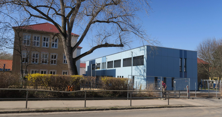 nachher - Blick von Norden auf den Erweiterungsbau der GS 18 (Sicht auf die KGS ist durch den Erweiterungsbau verdeckt), Bild: Sabine Schwerin -