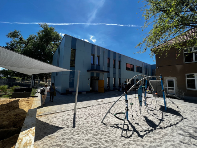 Blick von Osten, von der Straße Am Schwemmbach, auf den Erweiterungsbau, Bild: Sabine Schwerin -