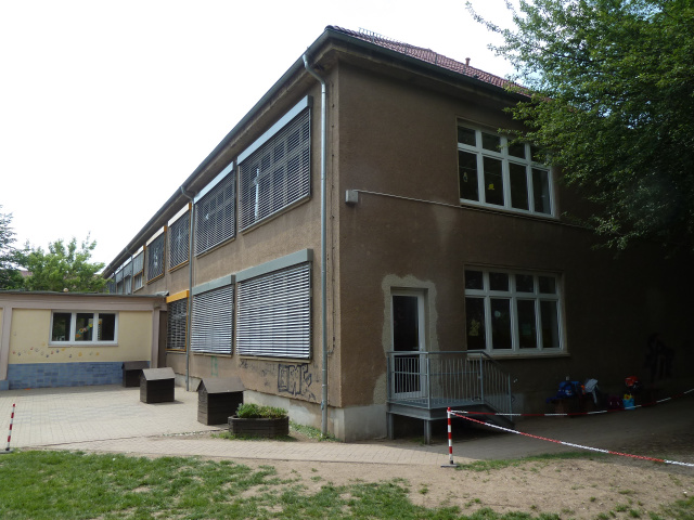 vorher - Blick von Nordwesten Richtung des alten Speiseraumanbaus und Bestandsgebäude der GS 18, Bild: Sabine Schwerin -