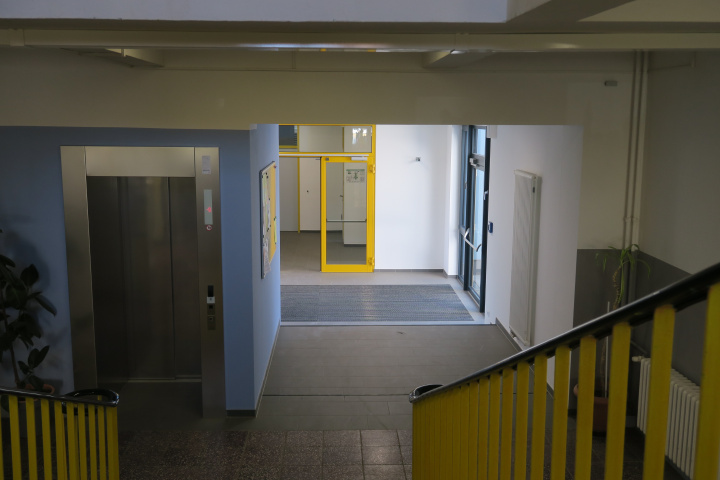 Im Verbinder ist ein Personenaufzug integriert, der die Geschossebenen barrierefrei verbindet.