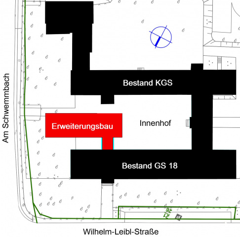 Der Erweiterungsbau wurde in den Abstandsbereich der Hauptgebäude der GS 18 und KGS platziert.