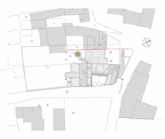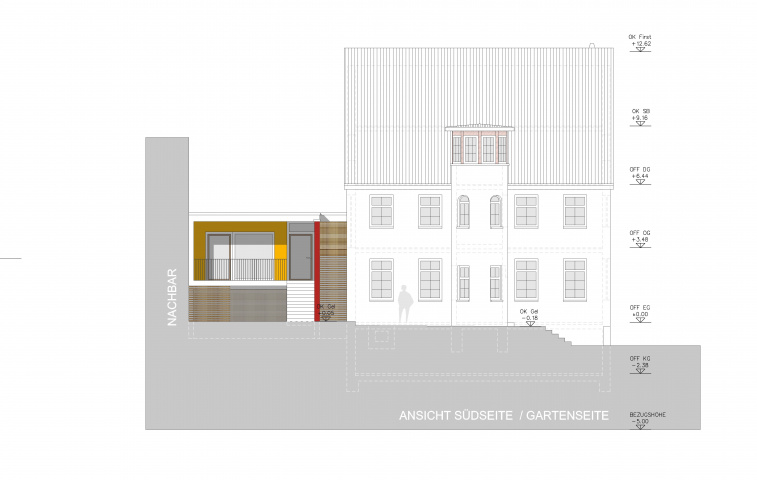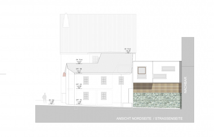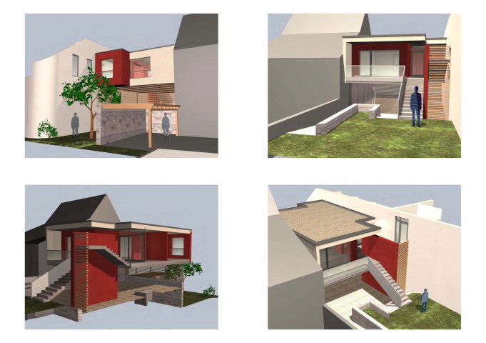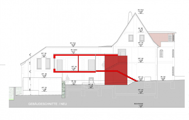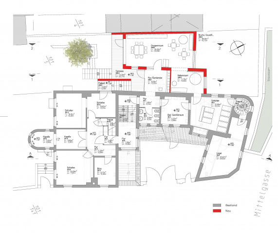 ein Entwurf aus dem Jahr 2011 zur baulichen Lösung von brandschutzlichen Missständen mit Erweiterung und Wiederaktivierung von bereits vorhandenen Gruppenbereichen. Durch die Schaffung einer simplen Fluchtwegesituation und der Aufständerung des Neubauteiles werden die noch vorhandenen Gruppenräume wieder aktiviert und eingebunden. Die weitere Versiegelung mit zusätzlicher neuer Baumasse einhergehend mit der Vernichtung der wertvollen Freifläche kann somit ausbleiben. Die neue Erweiterung tritt gegenüber dem vorhandenen Bestandsgebäude aus dem vorigen Jahrhundert zurück und bewahrt dessen Charakter und Aura.