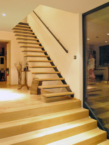 Im Erdgeschoss finden ein privater Wohnraum, der sich über großformatige Fensterflächen zum Garten öffnet, sowie ein kleiner offener Arbeitsbereich Platz. Vier Stufen überwinden den Höhenunterschied im Haus und werden in einer einläufigen Treppe zum Obergeschoss als Thema fortgeführt. Entwurfsbestimmend sind die fließenden Übergänge zwischen Innen- und Außenraum. Die neuen Räume werden "Freiräume".