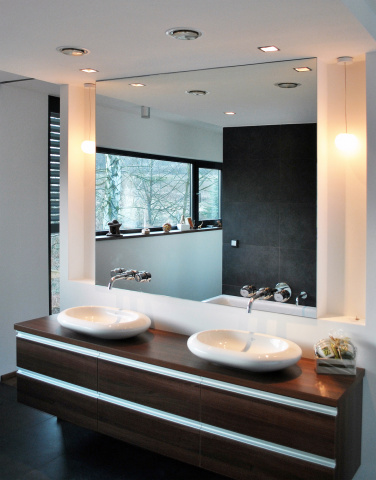 Das Obergeschoss, über einen Verbinder längs zur Treppe an das Haupthaus angebunden, nimmt das Elternschlafzimmer und ein großzügiges offenes Bad mit angeschlossenem Ankleidebereich auf. Über Schiebetüren lassen sich die als offenes Konzept geplanten Funktionsbereiche voneinander trennen.