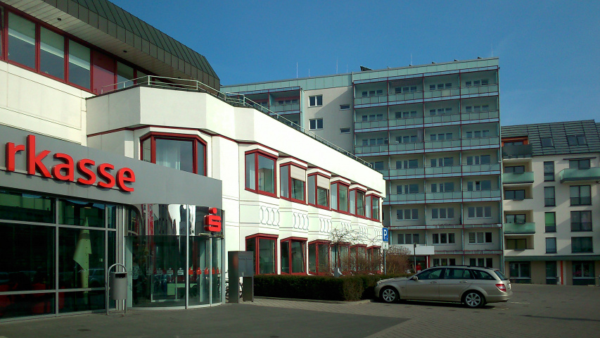 Das Sparkassengebäude wurde in den 1980er-Jahren in Vereinheitlichter Geschoss Bauweise (VGB) errichtet und seitdem mehrmals modernisiert und umgebaut.