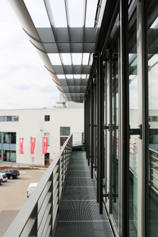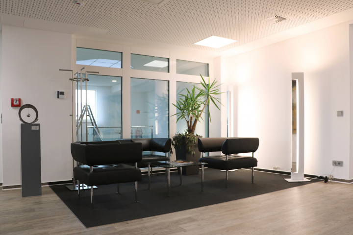Die aktuelle Aufgabe bestand darin, die Fläche der einstigen Dachterrasse aufzustocken, den Vorstandsbereich modern und lichtdurchflutet zu erweitern und umzugestalten. Dabei veränderten sich nicht nur die Wegebeziehungen auf der Ebene sondern auch Nutzungsbereiche wie ein Schulungsraum oder die Cafeteria für die Mitarbeiter. Diese, wie auch der neugeschaffene Konferenzraum und ein Büro, sind mit einer großzügigen Glasfassade und auskragendem Sonnenschutz zur darunterliegenden Hauptfassade mit einem schmalen Austritt zurückgesetzt. Die schlicht-moderne Möblierung mit Akzenten aus Holz-Akustikelementen ergänzt das Ambiente im Innenraum. Im Bestandsbereich wurden ein Druckerzentrum sowie die Sanitärbereiche für die Mitarbeiter umgestaltet. Alle Räume auf der Ebene sind nun klimatisiert.