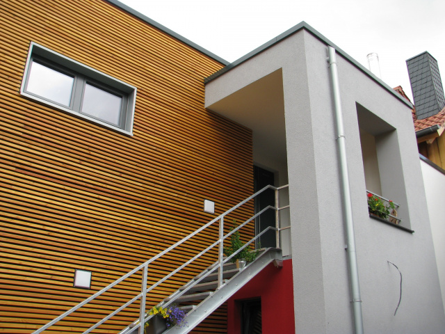 Das bestehende Wohnhaus wurde mit Wohnflächen im Obergeschoss und Geschäftsräumen im Erdgeschoss erweitert. Die Erweiterung erfolgte durch einen kubusförmigen Anbau in Holz-Trapezleistenoptik. Dieser nimmt im Erdgeschoss die neuen Geschäftsräume der Baumschule auf. Über die äußere Zugangstreppe erreicht man die im Obergeschoss befindliche Wohnung. Ihr neuer Eingangsbereich verbindet Bestandshaus und Anbau miteinander. Durch die Anordnung der neuen Gebäudeteile wurde der ehemals kaum genutzte, da frei einsehbare Balkon zu einem „offenen Wohnhof“. Mit der Möglichkeit des privaten Rückzuges bietet dieser eine hohe Aufenthaltqualität und wird zum zentralen Thema des Wohnens.