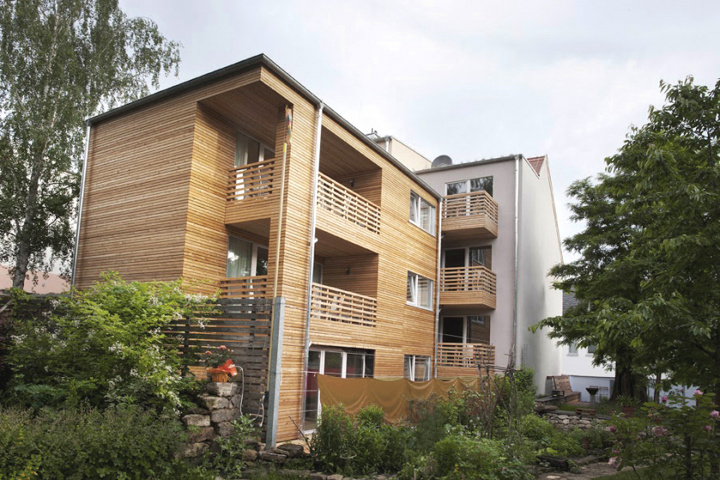 Alle Wände (außer Treppenhaus) aus 34 cm starken Vollholz-Tafeln aus kreuzweise vernagelten Nadelholz-Brettern (System Massivholzmauer) ohne weitere Wärmedämmung, daher Einstofflichkeit mit weniger Wärmebrückenproblematik.