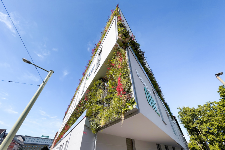 Die „grüne Fassade“ wurde auf 225 m² an den zurückspringenden Fassadenteilen realisiert. Dabei wurden auf einer Unterkonstruktion aus Aluminium fertig begrünte Pflanzenpaneele der Fa. Sempergreen (NL) montiert. Die Paneele bestehen aus einer wasserbeständigen Montageschicht, einer Bewässerungsmatte, einer Substratschicht sowie einer UV-beständigen Frontschicht. Die Pflanzen werden in Pflanzlöchern in den Paneelen untergebracht und mittels eines automatischen Bewässerungssystems mit Wasser und Nährstoffen versorgt. Das Regenwasser stammt dabei zum Teil aus der hauseigenen Zisterne.