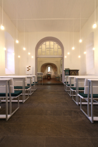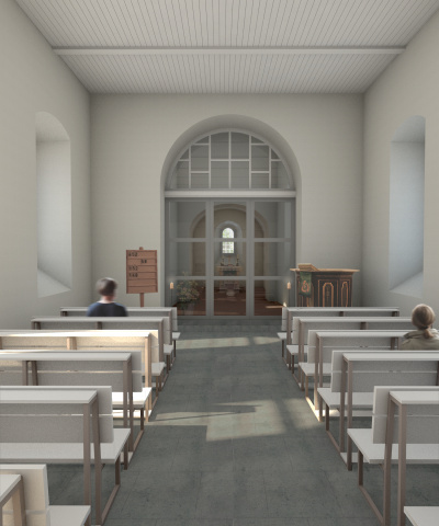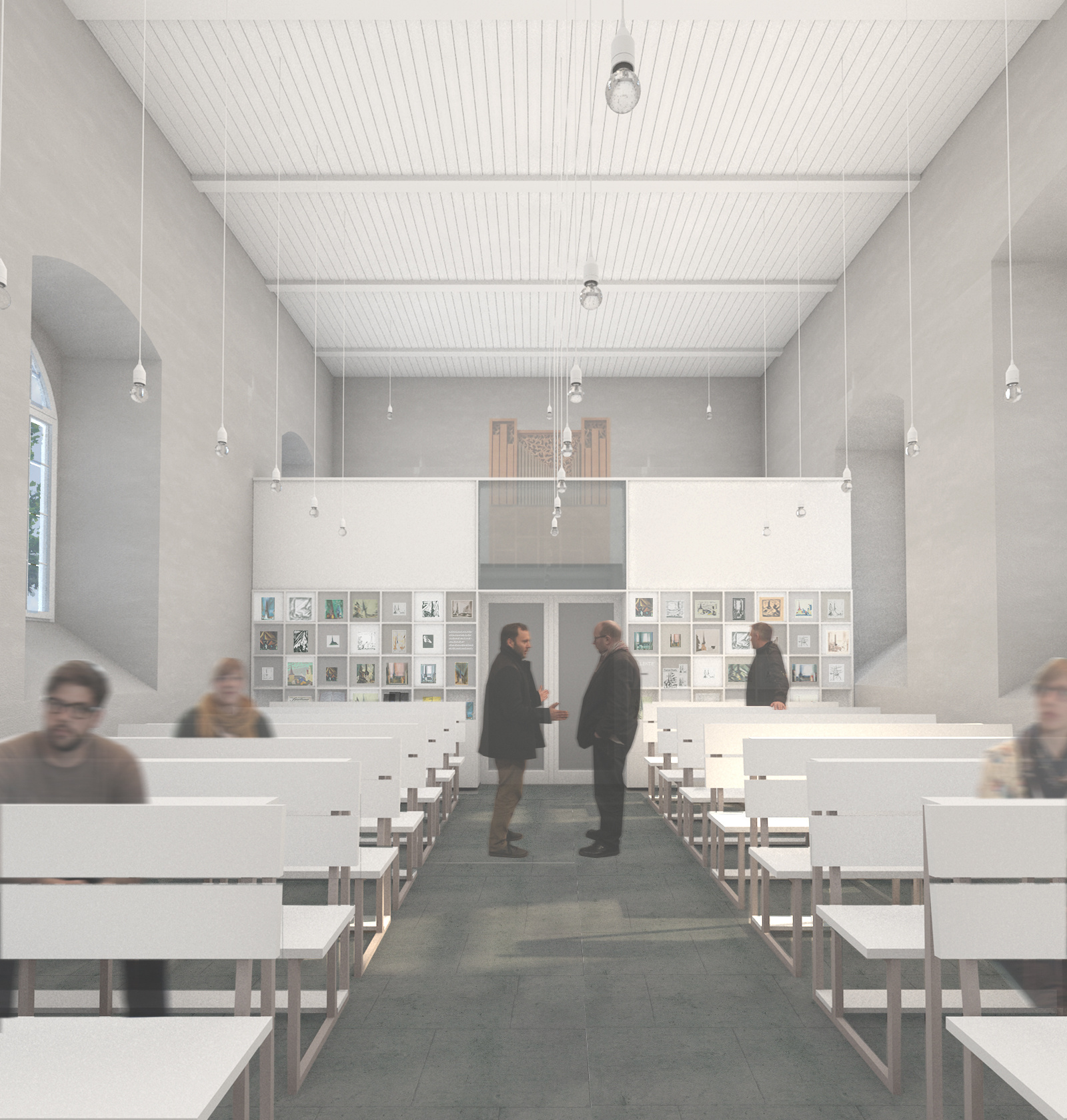 Der Entwurf stellt den Innenraum als Einheit wieder her und beruhigt diesen, durch eine reduzierte Farbigkeit, eine neue Beleuchtung sowie das Bündeln der Ausstellung an der Emporenwand. Hierzu wurde vor die bestehende Konstruktion aus den 1980ern ein Regal und Vitrinensystem gebaut. Wichtige liturgische Elemente wie die Kanzel, der Taufstein, der Altar und auch die Orgel sollten mit ihrer Farbigkeit in dem klaren Kirchenraum Akzente setzen und blieben unangetastet.