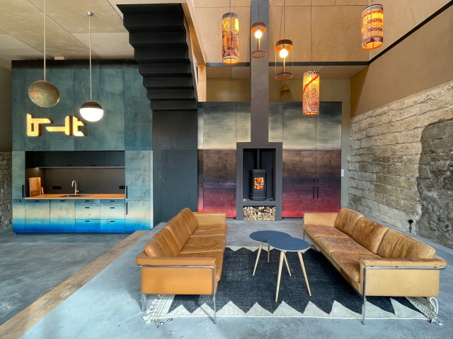 Der Innenraum wird von zwei Oberlichten geprägt. Oder handelt es sich um zwei Kaminabzüge im ehemaligen Feuerwehrhaus? In dem großzügigen Raum trifft man sich, kocht und tafelt gemeinsam oder lässt den Abend am Kaminofen ausklingen. Wer möchte, übernachtet auf einer Schlafempore.