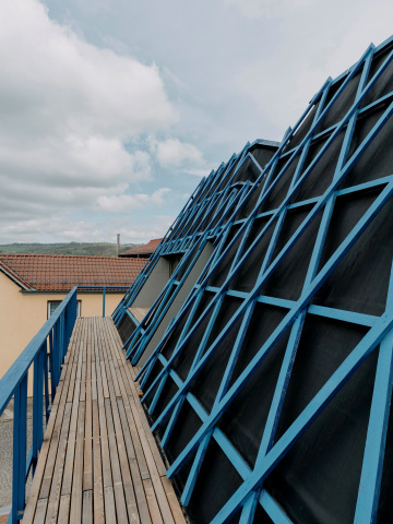 Die äußere Kubatur orientiert sich am Altbestand. Dort, wo vorher Toreinfahrten waren, öffnet sich das Erdgeschoss in breiten Fenstern nach Süden. Anstatt das ehemaligen Satteldachs erhielt das Gebäude zwei markante Hauben.