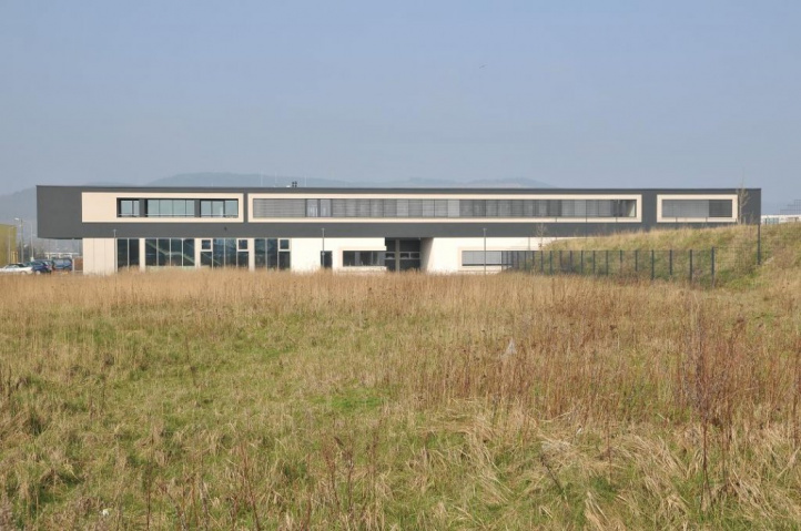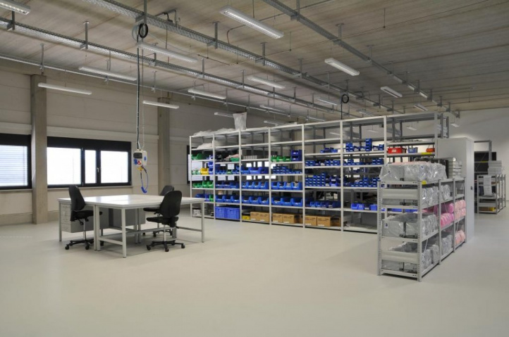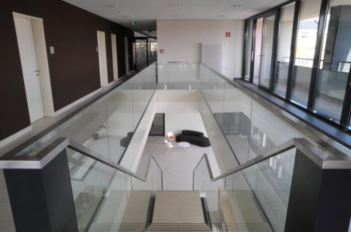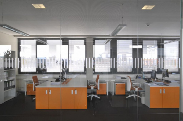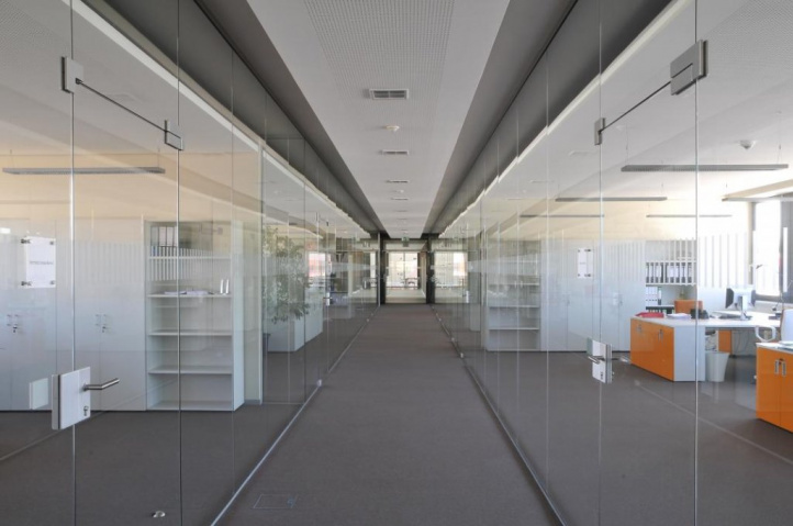 Über ein zentrales Foyer wird sowohl die Produktionshalle als auch der Büroteil erschlossen. Der durch Glaswände unterteilte Bürobereich befindet sich im 1.Obergeschoss.
