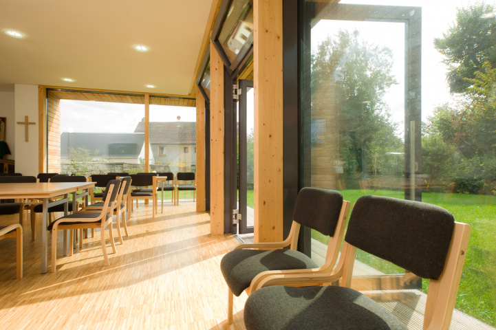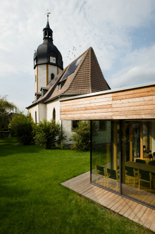 Die äußere Gestalt des Hauses ergibt sich aus der Funktion und dem Wunsch das Haus so stark wie möglich mit dem Ort zu verflechten, es wird daher in Material und Kubatur zurückhaltend ausformuliert und behutsam an die Umgebung angepasst. Die Fassade öffnet sich großflächig zum südöstlichen Kirchhof mit der Kirche als Platzkante und schließt sich nach Norden und Westen zur Kirchhofsmauer hin ab. Die großflächige Öffnung der Fassade im Südosten ermöglicht es uns die Kirche immer spürbar im Gemeindehaus zu erleben und den sonnigen Kirchhof in das Haus zu tragen. Veranstaltungen können somit Innen wie Außen stattfinden und von dieser Verzahnung des Gebäudes mit seinem Außenraum profitieren. Das historische Kirchgebäude ist hierdurch im Gemeindehaus und außerhalb stark einbezogen und spürbar.
