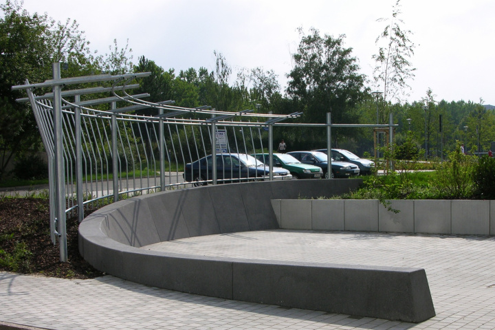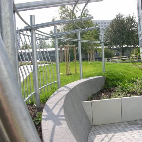 Im Kontrast dazu werden die geometrischen Formen mit weichen bewegten Linien in Form von Mauern, Pflasterbändern und Geländemodellierungen durchzogen.