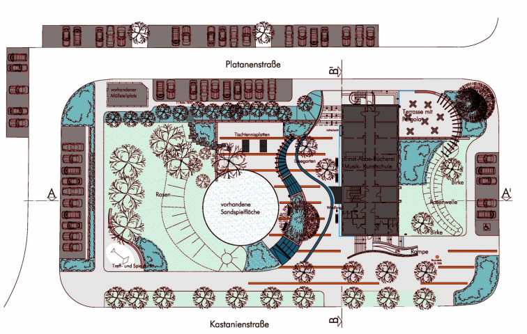 Im Zusammenhang mit der Sanierung des Musikschul- und Bibliothekgebäudes durch Architekturbüro Schlotter und Timm - Stadtroda wurden die Freiflächen grundhaft neugestaltet.