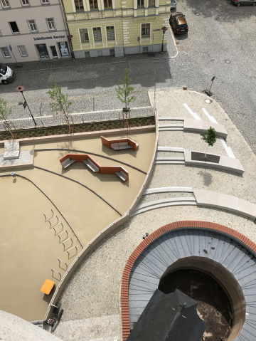 Die Planungsansätze bei der Neugestaltung des Schulhofes orientierten sich neben der Erhöhung der Aufenthalts- und Erholungsqualität auch an historischen Begebenheiten. So wurde der natürliche Höhenverlauf des Geländes durch eine Sitzstufenanlage wieder hergestellt, der östlich steil im Gelände beginnt und nach Westen ausläuft. Der nicht mehr existierende Zugang von der Straße in der Hauptachse der Schultreppe wurde mit einer neuen Freitreppe an historischer Stelle auf moderne Art interpretiert. Die städtebauliche Großzügigkeit des eigentlich für heutige Ansprüche zu kleinen Pausenhofes ist durch die Öffnung des Bereiches am Weißen Turm wieder erlebbar. Der Schulhof wird zu einem Teil des städtisches Raumes.
