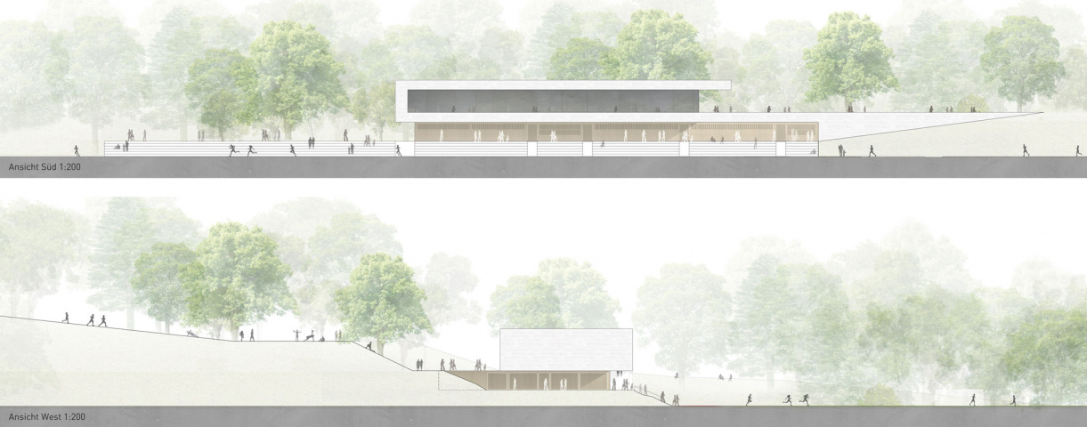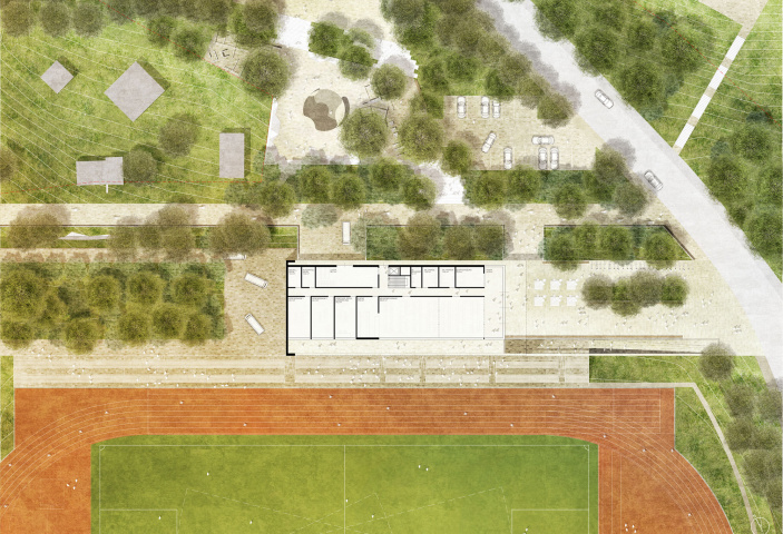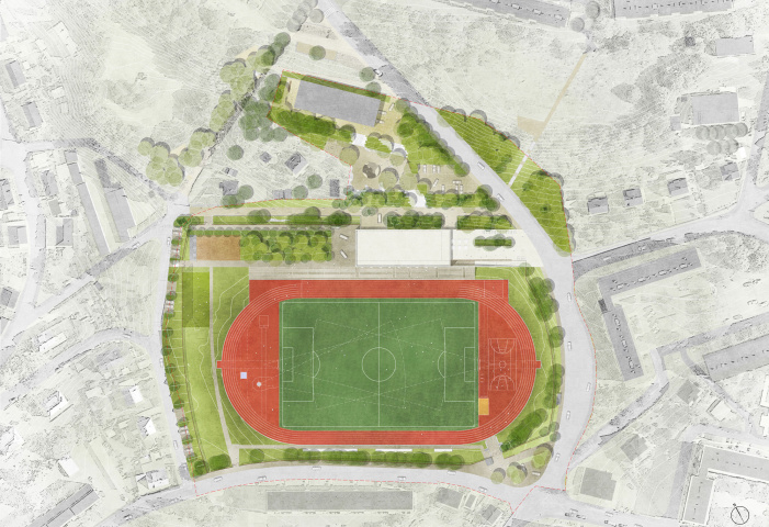 Das einfache, sensibel aus der Topografie entwickelte Gebäude besteht aus insgesamt zwei Geschossebenen, eine davon als Sockel in den Hang geschoben und die oberste als leichter transparenter Baukörper mit einem langgestreckten Dach, das sich wie ein Band in den Vorplatz hinein entwickelt. Das Stadion bekommt so eine räumliche Rahmung und das Sportzentrum wird beschattet und wettergeschützt.