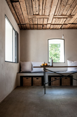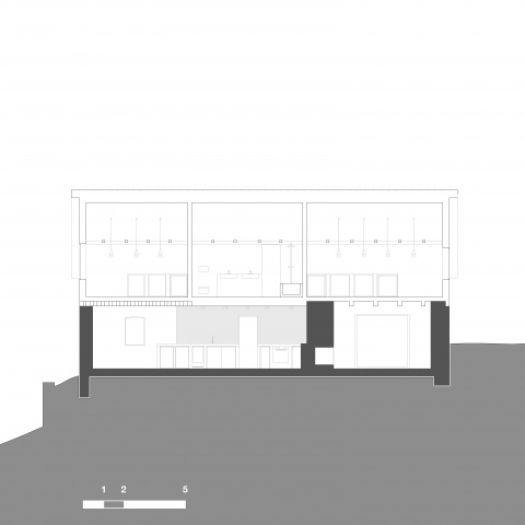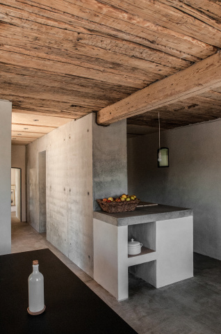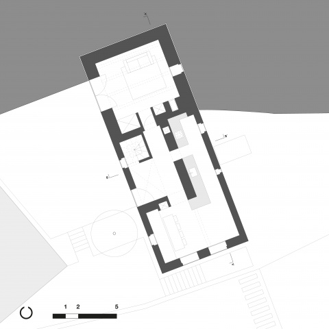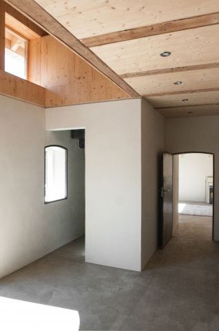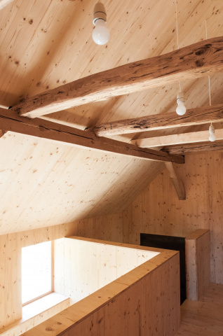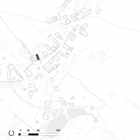 Den ortstypischen Baukörpern entsprechend lassen sich die Gebäude in massive und leichte Elemente unterteilen. Der Sockelbereich als Basis wird massiv ausgebildet, darüber befindet sich eine Holzkonstruktion. Alle Räume werden ihrer Funktion entsprechend massiv aus Stein oder in Leichtbauweise aus Holz gefertigt. Die daraus entstehenden, sich in ihrer Materialität unterscheidenden Volumen greifen ineinander. Zwischen den Materialien entsteht eine Fuge. Der Entwurf entwickelt diese bestehende Fuge weiter und formuliert sie im Detail bewusster aus. Es entstehen Schwellenräume zwischen Stein und Holz – die Fuge wird erlebbar gemacht.