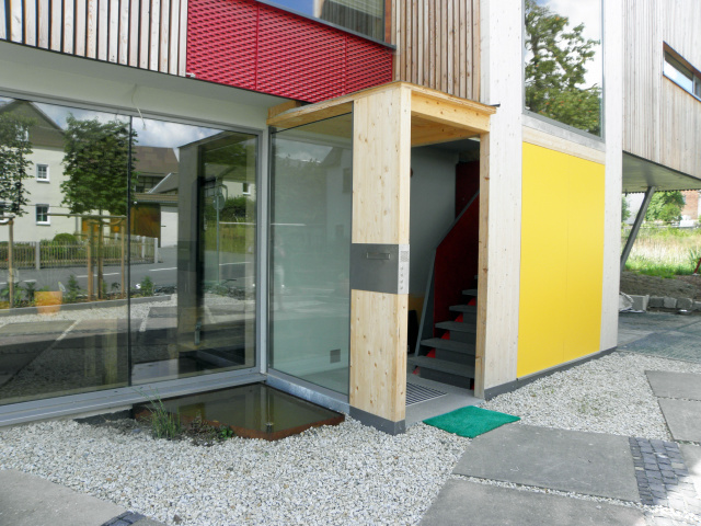 Der ehemalige Dorfkonsum, ein Gebäude aus den 1960er Jahren, bietet die Basis für das neu errichtete Gäste- und Seminarhaus "SELBST -gemacht". Auf den Bestand wurde ein Kubus gesetzt, der 3 seitig leicht, hangseits weit auskragt und somit, unter Berücksichtigung der gebotenen Abstandsflächen, eine maximale Gebäudeausdehnung ermöglicht. Darauf ordnet sich, das von Terrassen und Gründächern umrahmte Penthouse an. Die konstruktiven Bauteile sind in Holzrahmenbauweise und als Massivholzdecken ausgeführt. Aussenwände und Decken sind mit Zellulosedämmung energetisch optimiert. Die hinterlüftete, mit Lärchenholz und farbigem Streckmetall verkleidete Fassade, adaptiert die ortsüblichen Materialien und Farben. Im Hofladen sollen regionale Produkte und Kunsthandwerk angeboten werden. Das Obergeschoss bietet einem grosszügigen Seminarraum, dem Frühstücksbereich, sowie acht individuell eingerichteten Gästezimmern Platz. Alle Räume sind durchgängig mit ökologischen Materialien wie Lehm, Tadelakt, Beton Cire und Linoleum ausgestattet. Die in Eigenregie entworfenen und gebauten Möbel aus Birkensperrholz wurden, wie alle Holzoberflächen geölt.