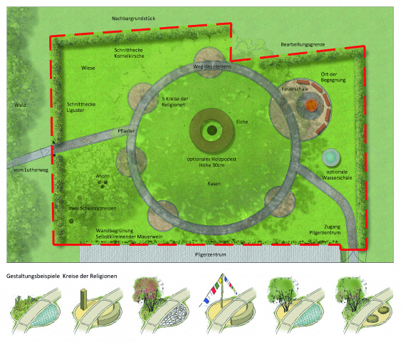 Der Garten entstand als gemeinsames Projekt einer Initiative aus ansässigen Menschen, teils mit Migrationshintergrund und unterschiedlichen Konfessionen. Religionen werden sinnbildlich verortet, vereint, als Ort des Friedens und der Ökumene. Die Geschichte von Reinhardsbrunn, als Wiege des mittelalterlichen Thüringens, wurde gewürdigt und eine mächtige Eiche integriert. Beteiligt waren die Religionen Buddhismus, Christentum, Bahaitum, Islam, Judentum, welche jeweils einen kleinen Platz für sich gestalteten und nutzen. Trotz Unterschiedlichkeit der Menschen und ihrer Religionen gibt es Gemeinsamkeiten - die Liebe, symbolisiert durch den verbindenden „Weg des Herzens“. An einem gemeinsamen Ort führen Rhythmus, Gesang und Gebet in Dimensionen, welche als heilig und heilend empfunden werden.