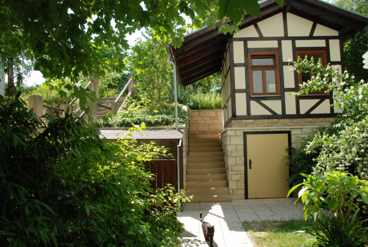 Der über all die Jahre stark verwilderte Garten wurde mit viel Liebe zum Überlieferten rekonstruiert. Bedingt durch die Hanglage ergeben sich verschiedene Nutzungsbereiche: Von der Straße gelangt man durch den Vorgarten zum Haus, dem schließt sich ein begrünter "Hof" mit Zuordnung zur Erdgeschoßwohnung an. Mittels Mauern und Treppen und den zugehörigen, mit Stauden und Gehölzen bepflanzten Böschungen werden die Höhenunterschiede von insgesamt 6 m überwunden. Dazwischen sind liegen in der 2. und 3. Ebene Rasenflächen und ein kleiner Gemüsegarten.