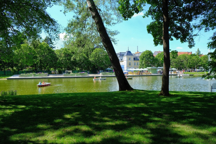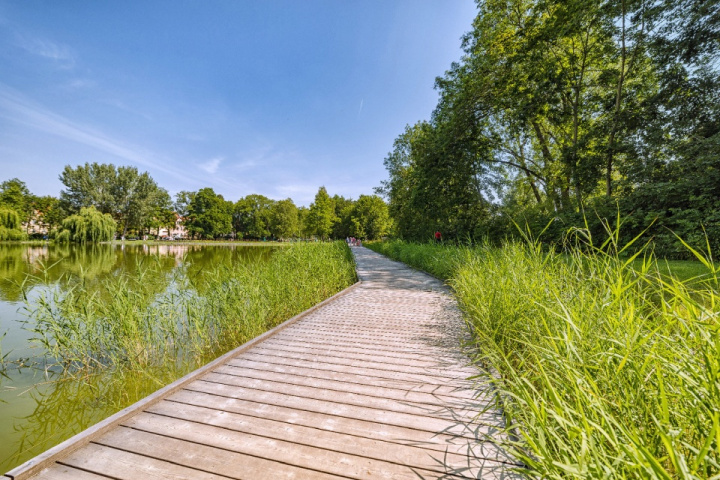 In Verbindung zur Innenstadt entstand am Lohteich eine intensiv gestaltete urbane Promenadenkante. Die stärker landschaftlich und extensiv gestaltete Uferzone des Friedensteiches wird durch Stegkonstruktionen erschlossen. Die Passerelle, ein Holzsteg, der durch die Röhrichtzone des Sees führt, sowie der gegenüberliegende Blickpunkt der Seerosenterrasse setzen den Uferbereich unaufgeregt aber wirkungsvoll in Szene. Anschließende weite Wiesenflächen vermitteln in der Übergangszone zur Landschaft. Durch zwei neue Fußgängerbrücken wird der angrenzende Sport- und Freizeitbereich sinnvoll mit der Parkanlage und der Innenstadt verbunden. Die Jury würdigt die behutsame Erneuerung einer historischen Gartenanlage mit gezielten und angemessenen landschaftsarchitektonischen Eingriffen in Vegetations- und Wegestruktur.