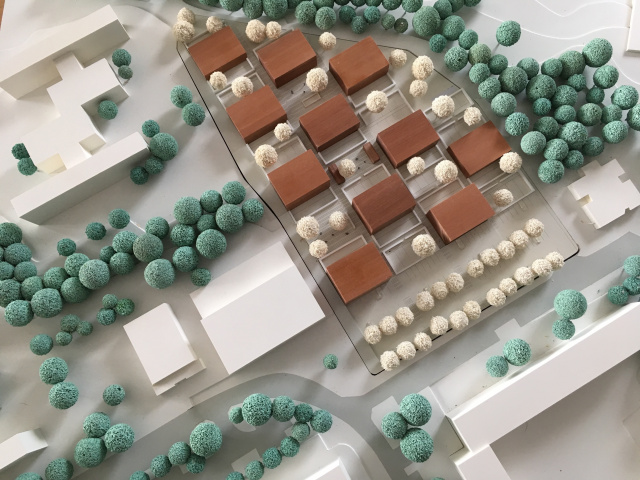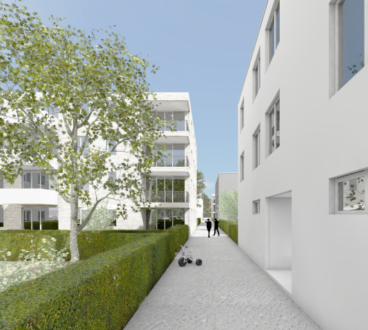 Die Volumina orientieren sich an dem gegenüberliegenden Fünfgeschosser, werden jedoch in gleiche Einheiten zerschnitten, die funktionierende Hausgemeinschaften von 6-22 Parteien beinhalten.