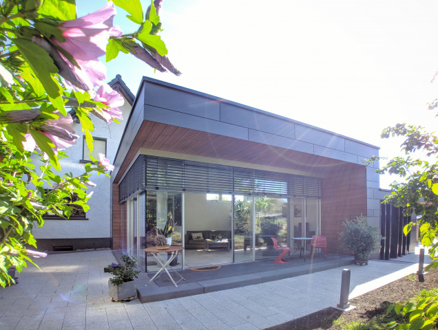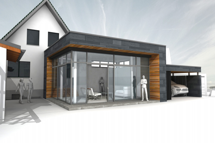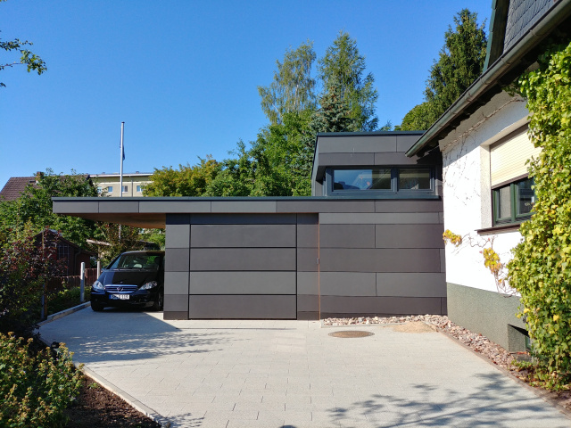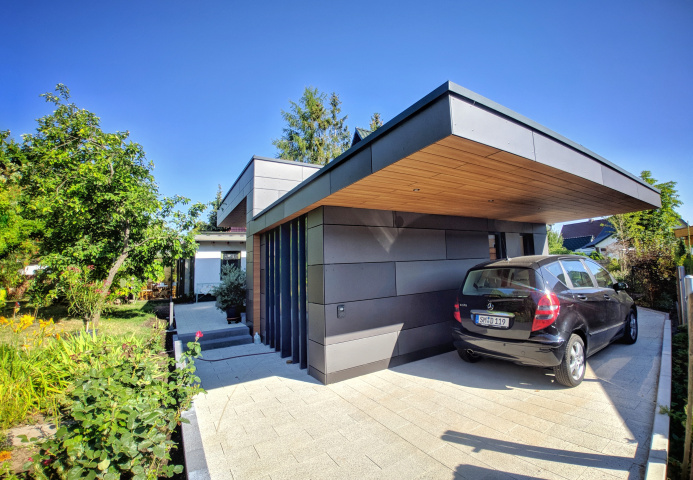 Entstanden ist ein eingeschossiger Anbau in Kombination mit Garage und Carport.