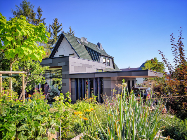 Die Fassadenbekleidung wurde mit Eternit Fassadentafeln ausgeführt.