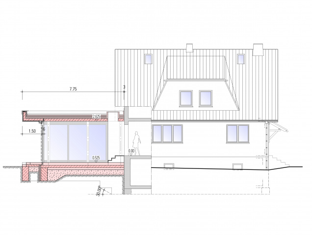 Der Bauherr wünschte sich mehr Bewegungsfreiheit im Wohn- und Aufenthaltsbereich und beauftragte die Erweiterung durch Anbau an das Wohnhaus mit dem Anspruch an zeitgemäßes, repräsentatives Wohnen.
