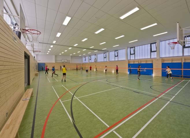 Die Generalsanierung der Sporthalle bedeutet nun der Abschluss der Arbeiten auf dem Schulcampus. Dazu gehört die Herstellung der Barrierefreiheit sowie die Umsetzung des Brandschutzkonzepts. Weiter wurden die Freianlagen inkl. der Anlage einer 100 m-Bahn und einer Weitsprunganlage grundlegend neugestaltet.