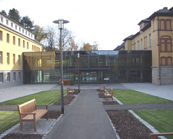 Rückbau der gegenwärtigen Zufahrt an der Kreuzung Ernst-/ Goethestraße: Hier ist nur noch ein Fußweg geplant (kurze Verbindung zu Stadt und Bahnhof); Separate Wirtschaftszufahrt im Osten an der Goethestraße (Bestand); Eingangshof und Terrassenhof auf Ebene 1 (Sockelgeschoss).