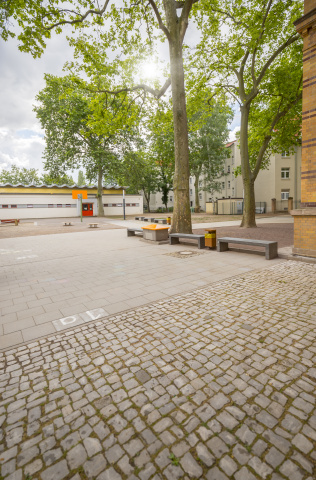 Im gebäudenahen Teil des Schulhofs wurde aufgrund denkmalschutzrechtlicher Auflagen das Mosaikpflaster wieder hergestellt. Im Anschluss befindet sich die befestigte Schulhoffläche, welche mit dem Plattenbelag auch ausreichend Platz als Rollerstrecke bietet. Sie ist zudem der Haupteingang und Zugang zur Turnhalle, welche auch vom Vereinssport genutzt wird. Die sich anschließende Fläche wurde als Splittfläche gestaltet. Dadurch konnten Flächen entsiegelt und der Wurzelraum der vorhandenen acht großkronigen und den Freiraum prägenden Platanen geschont werden. Auf dem Schulhof bieten eine Balancierstrecke, ein Basketballkorb, 2 Wackelplatten, Tischtennisplatten und ein Gurtsteg abwechslungsreiche Möglichkeiten der Bewegung.