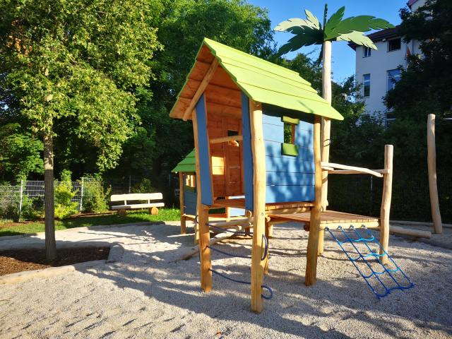 Der Freiraum des Hortes wurde unter Beachtung des vitalen Altbaumbestandes und der gegebenen Topografie umgestaltet. Die Überformung alter Strukturen unter Beachtung funktioneller Anforderungen stand im Vordergrund.