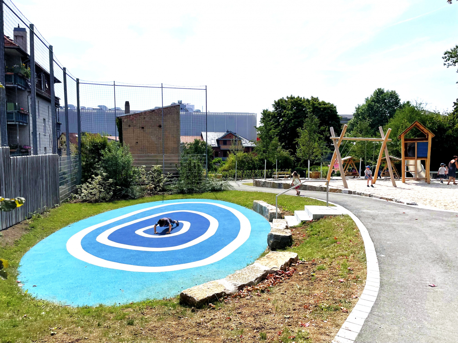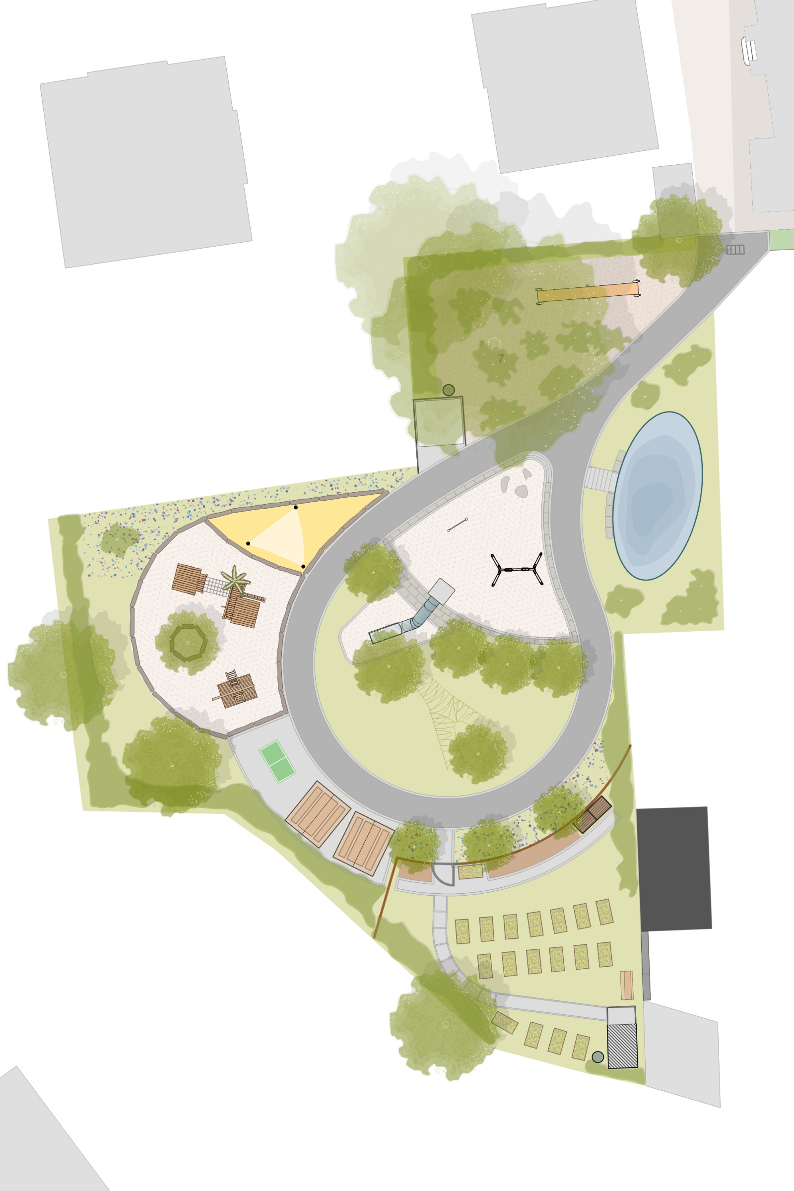 Auf der Freifläche des Hortes war ein Hauptanliegen, neben der barrierefreien Erschließung, eine naturbezogene Spielfläche zu schaffen, die körperliche Aktivität, soziale Interaktion und Fantasie fördert, während sie gleichzeitig einen sicheren Raum bietet, in dem Kinder ihre Fähigkeiten entdecken und sich von den Schulaufgaben erholen können.