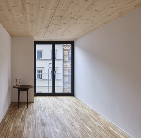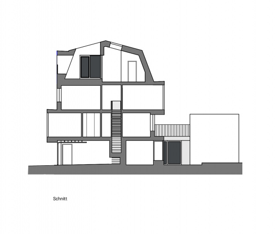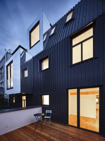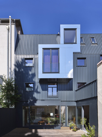 Blechbüchsenviertel nannten die Einheimischen einst die nördlichen Stadtviertel der Landeshauptstadt. Auf der Ostseite der Straße liegt das viergeschossige Zweifamilienhaus. Die Wohneinheiten sind derart miteinander verzahnt, dass die eine, dreigeschossig, den rückseitigen Garten erhält, während die andere sich über alle vier Geschosse nach oben entwickelt und zu zwei geräumigen Dachterrassen öffnet. Beide Wohnungen bieten Platz für vier- bis fünfköpfige Familien und je ein Auto. Die dunkle Blechfassade zieht sich über das steile Dach und erinnert selbstbewusst an das Blechbüchsenviertel. Darunter verbirgt sich eine Holzkonstruktion. Verspiegelte Erker adeln die ruppige Oberfläche. Erdwärme liefert die Energie für Heizen und warmes Wasser.