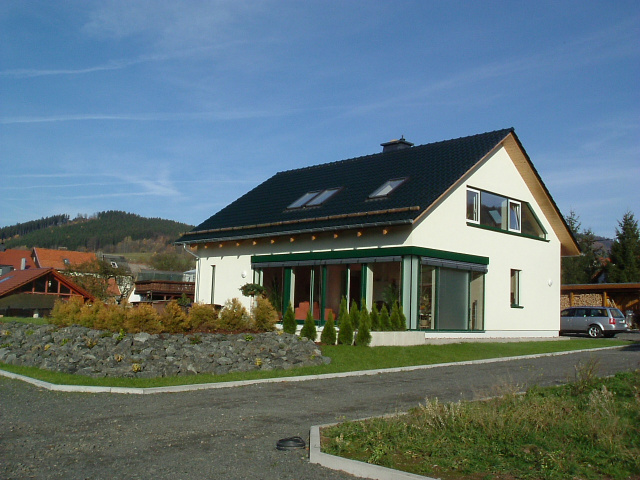 Neubau eines Einfamilienhauses. Mischbauweise Erdgeschoss massiv Ziegelmauerwerk, Dachgeschoss Holzbalkendecke und Dachbinderkonstruktion.
