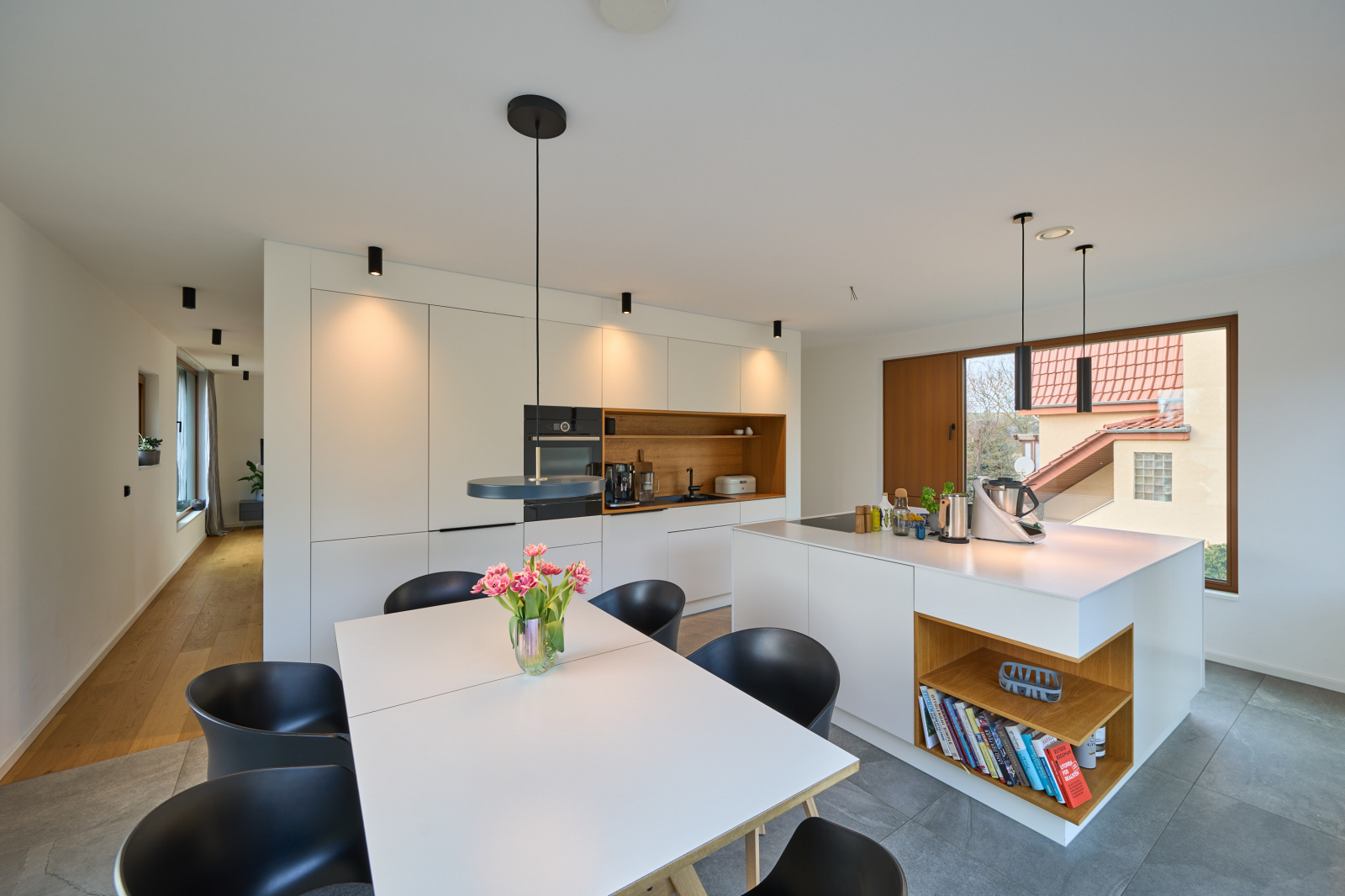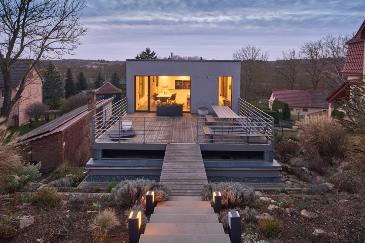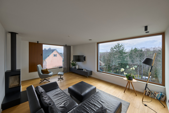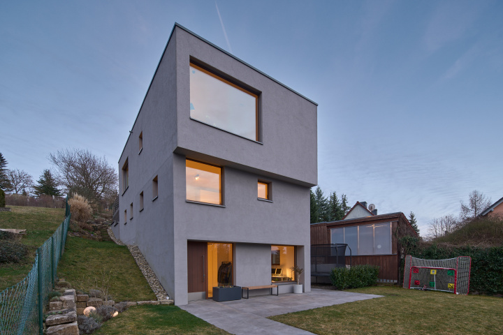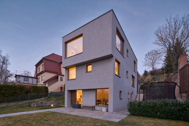 Am Hamburger Berg in Erfurt entstand ein dreigeschossiges Wohnhaus, das sich schlank und quer in das stark geneigte Grundstück einfügt und zwischen den Höhen der Nachbarbebauung vermittelt. Das Volumen ist zurückgesetzt, sodass es von der Straße her als zweigeschossig wahrgenommen wird und unter der Traufhöhe der Umgebung bleibt. Ein massiver Sockel verankert das Haus im Gelände, darüber entwickeln sich die Wohngeschosse. Versätze und differenzierte Putzstrukturen gliedern die Fassade, großformatige, funktional gesetzte Öffnungen inszenieren Belichtung, Blickbezüge und die Verbindung zum höher liegenden Garten.